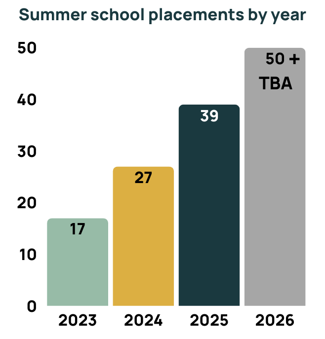 Dozens of students have experienced these unforgettable trips since 2023. Placements are provided free of charge thanks to the incredible generosity of our summer school partners, and we cover the cost of travel and visas.